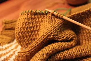 Picking the work back up, i transfer each sleeve stitch (the series of stitches that are before the next marker) onto the scrap yarn.